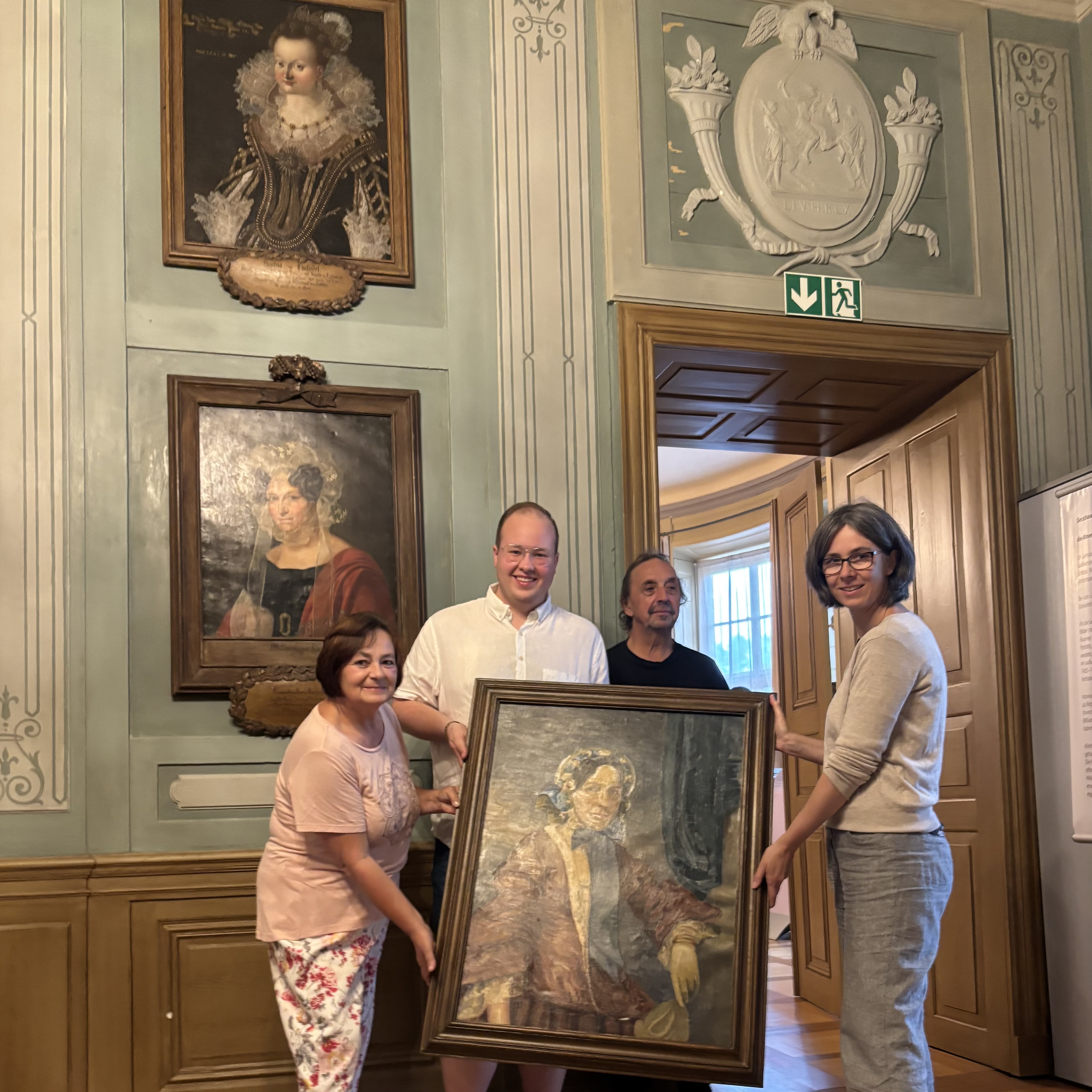Die feierliche Übergabe des Rahmens mit Gemälde an Museumsleiterin Dr. Barbara Wiegand-Stempel (r.) erfolgte durch Andrea Heinig (stellvertretende Vorsitzende) und Marvin Müller (Vorsitzender) gemeinsam mit Dipl.-Restaurator Thomas Heinicke (v. l.).
